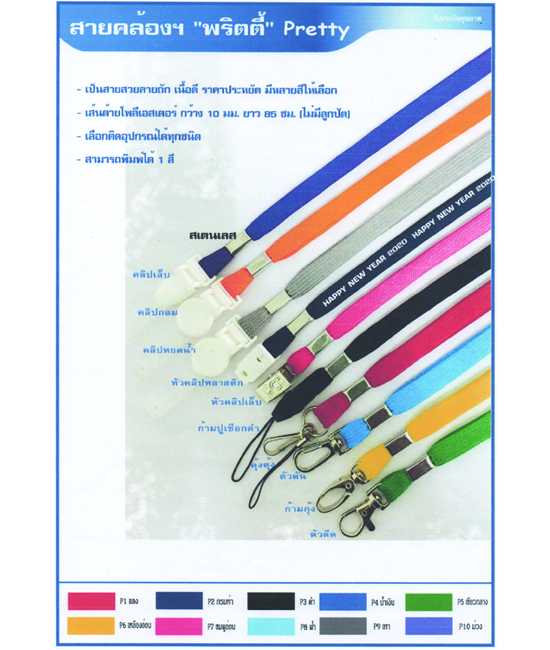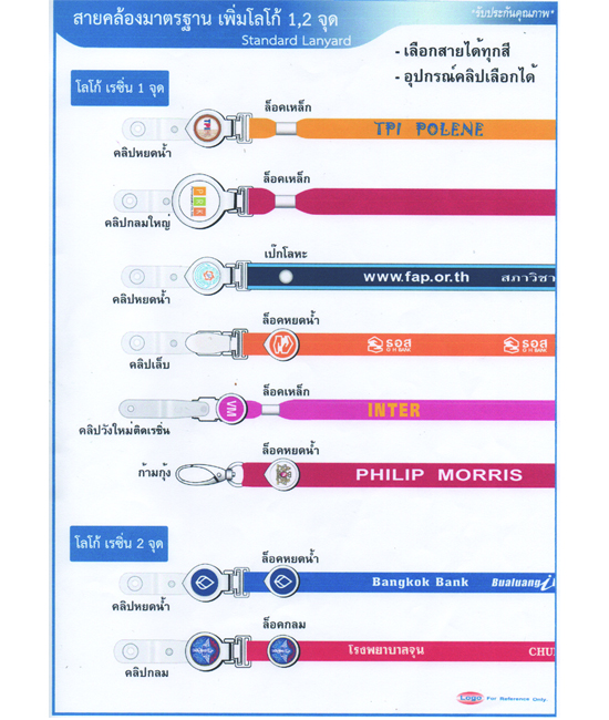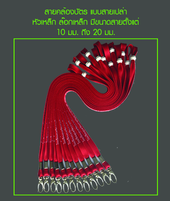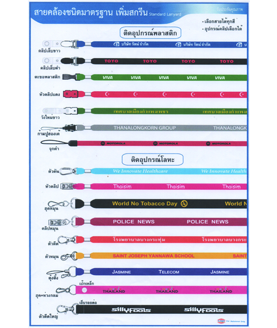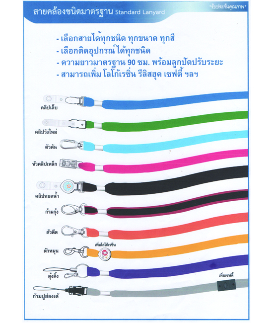 เราคือผู้ผลิตสายคล้องคอพิมพ์ชื่อ สายคล้องบัตร,สายคล้องคอ,บัตรพนักงาน, บัตรสมาชิกทุกชนิด, กรอบบัตร, ซองใส่บัตรทั้งซองพีวีซีและซองหนัง รับผลิตบัตรพลาสติกทุกชนิดเช่น บัตรประจำตัวพนักงาน, บัตรนักเรียน บัตรนักศึกษา, บัตรสมาชิก,สายคล้องคอพร้อมหัว และบัตรทุกชนิด เหมาะกับองค์กรทุกขนาด ไม่มีขั้นต่ำ สายคล้องมีลักษณะ และวัสดุที่แตกต่างกันไปตามการใช้งานหรือประเภทของวัตถุที่ต้องคล้อง สายคล้องคอมักมีหลายสไตล์ และลวดลายที่สามารถเลือกใช้ได้ตามความชอบของแต่ละบุคคลบางครั้งสายคล้องคอก็ถูกใช้เป็นเครื่องประดับ หรือแสดงความเป็นตัวตนของบุคคล สำหรับการเลือกใช้สายคล้องคอ คุณสามารถเลือกสไตล์ที่ตรงกับการแต่งกายหรือที่คุณต้องการเสมอได้ อีกทั้งสายคล้องคอยัง เป็นของขวัญที่น่าสนใจสำหรับคนรอบข้าง