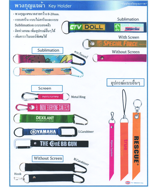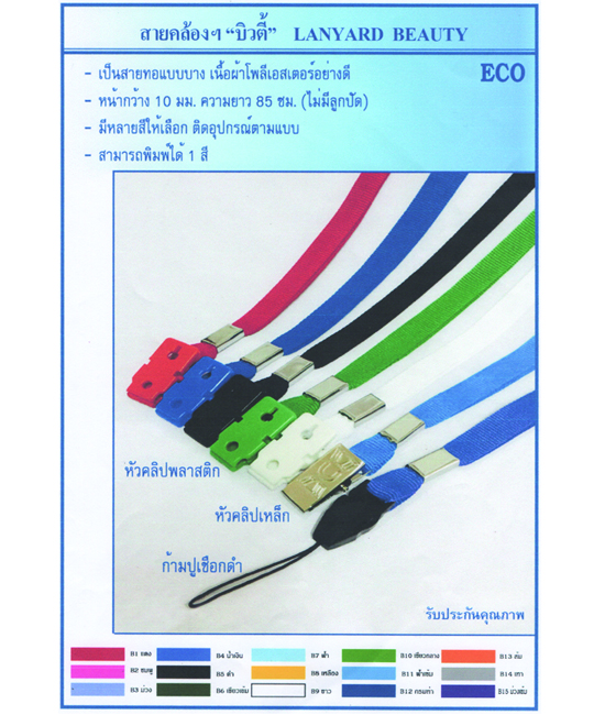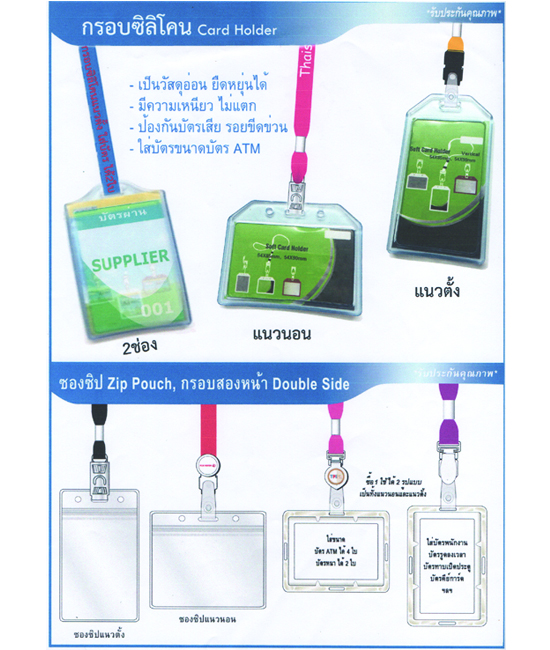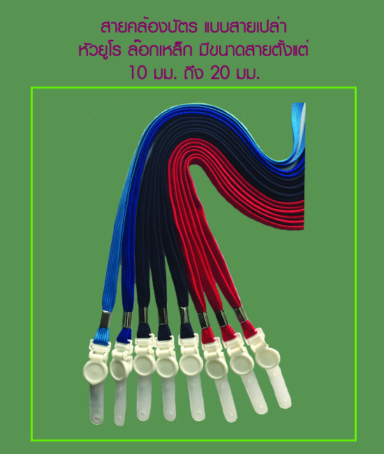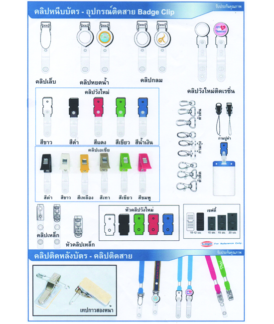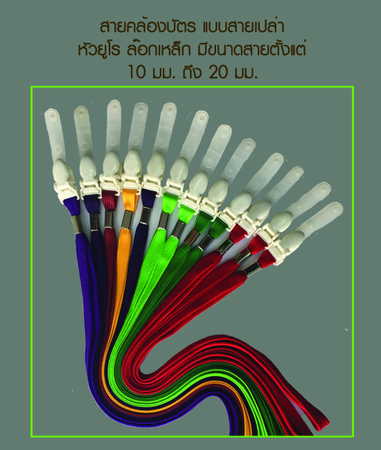 เรารับผลิต และ จำหน่าย สายคล้องบัตร ต่าง ๆ เช่น สายคล้องบัตรพนักงาน สายคล้องคอ สายคล้องมือ สายคล้องแมส ด้วยอุปกรณ์เสริมที่หลากหลาย คุณภาพดี เพื่อประกอบสายคล้องบัตรพนักงานเพื่อตอกย้ำความเป็นองค์กร ดูสวยงามเป็นระเบียบ สะดวกต่อการใช้งาน เรามี ซองพลาสติกใสใส่บัตรพนักงานแบบต่าง ๆ หลายราคาให้ท่านเลือก สายคล้องบัตร และอุปกรณ์เกี่ยวกับบัตรรวมถึงกรอบใส่บัตร และคลิ๊ปโยโย่ด้วยประสบการณ์ ที่มุ่งเน้นเรื่องคุณภาพของงาน สายคล้องบัตร เพื่อให้ลูกค้าใช้งานได้นาน และบริการด้วยใจพร้อมทั้งเรากล้าที่จะรับประกันงาน สายคล้องบัตร และสินค้าของเรา