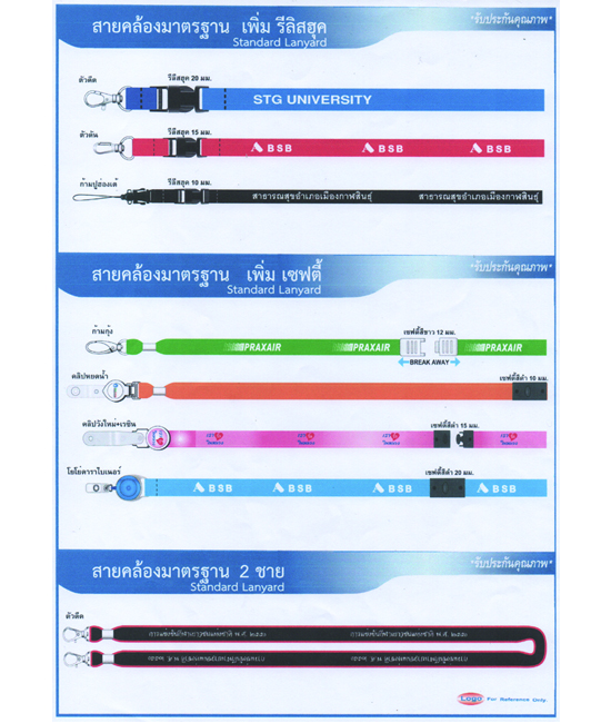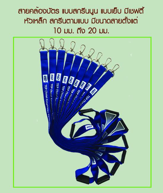 สายคล้องบัตรพิมพ์ แบบสกรีนนูน แบบเย็บ มีเซฟตี้ หัวเหล็ก สกีนตามแบบ มีขนาด 10 มม.ถึง 20 มม.