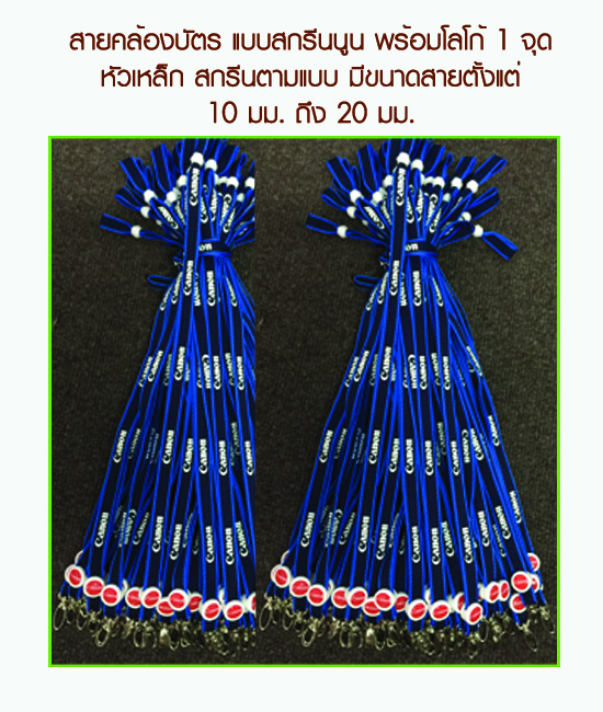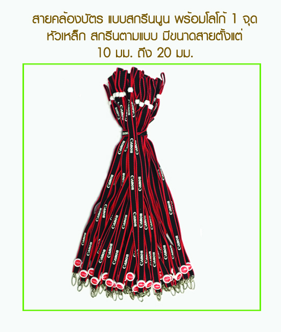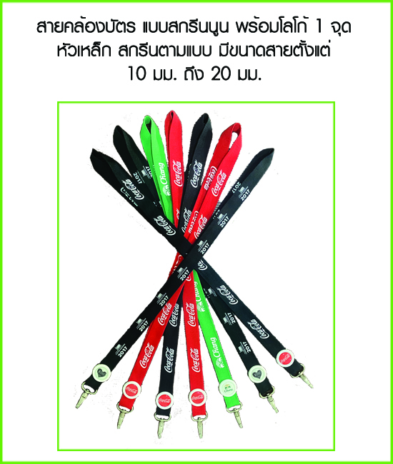 สายคล้องบัตรพิมพ์ แบบสกรีนนูน พร้อมโลโก้ 1 จุด หัวเหล็ก สกีนตามแบบ มีขนาด 10 มม.ถึง 20 มม.