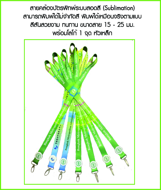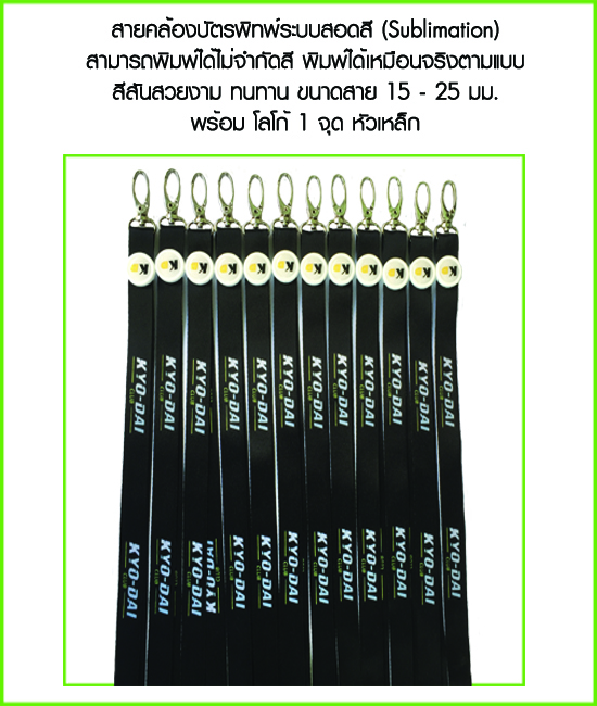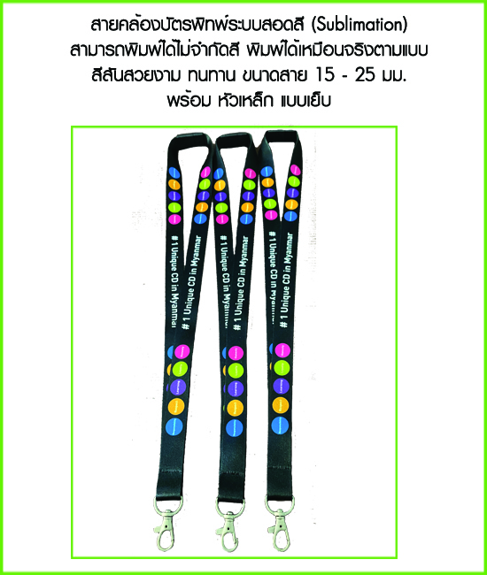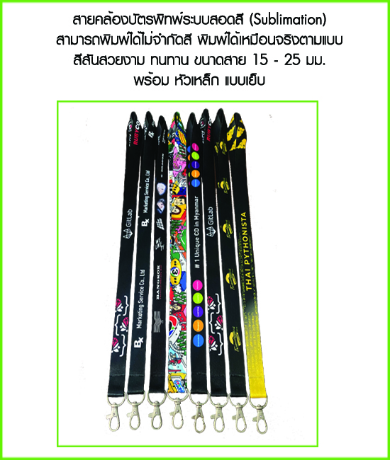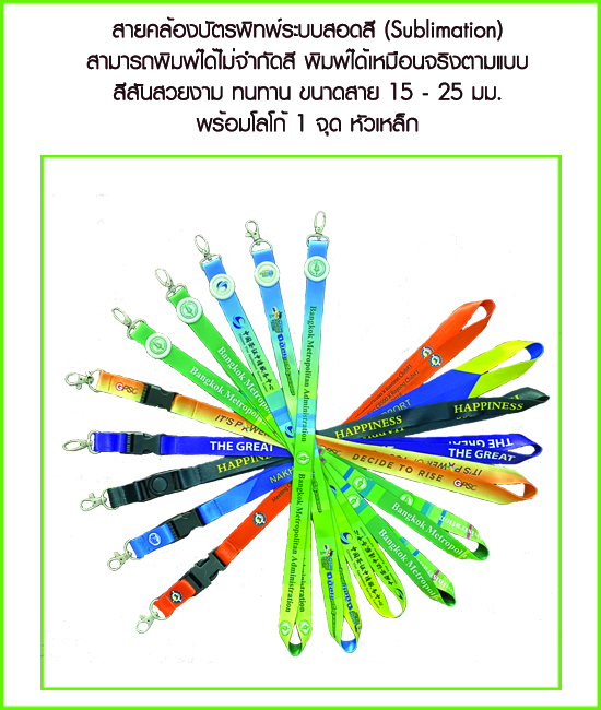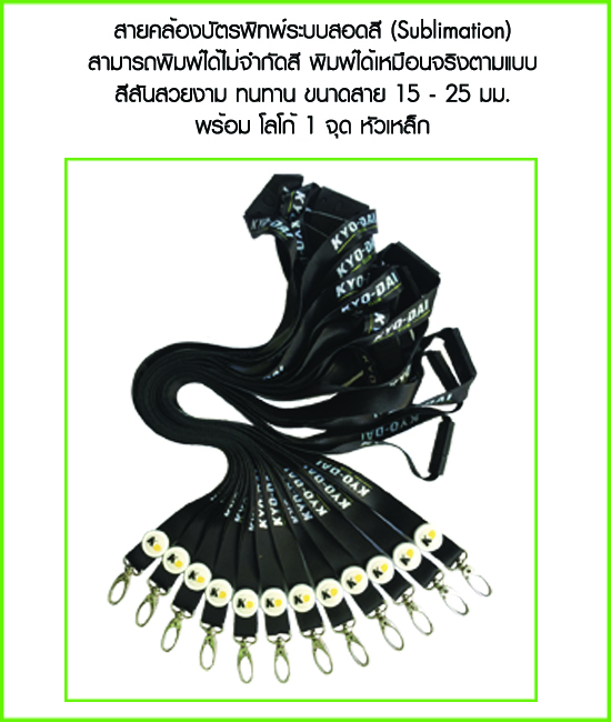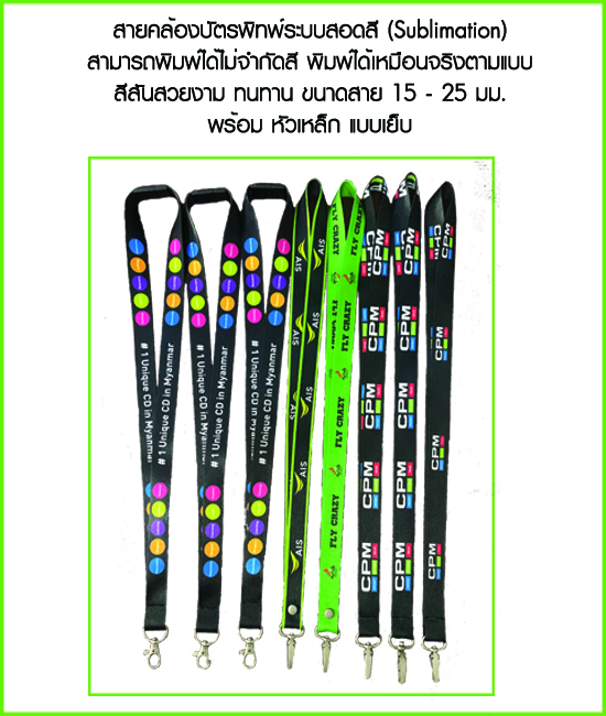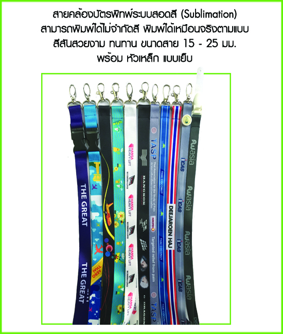 สายคล้องบัตรพิมพ์ระบบสอดสี (Sublimation) สามารถพิมพ์ได้ไม่จำกัดสี พิมพ์ได้เหมือนจริงตามแบบ สีสันสวยงานทนทาน ขนาดสาย 15-25 มม. หัวเหล็ก