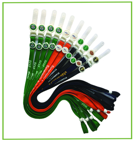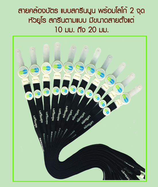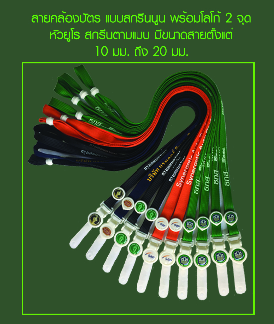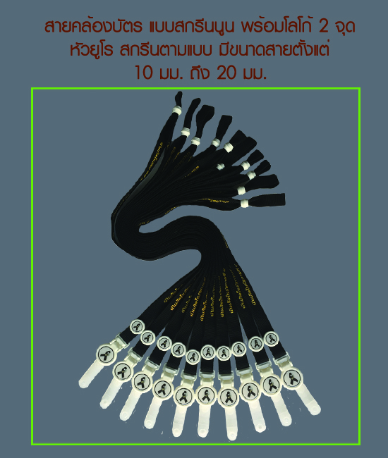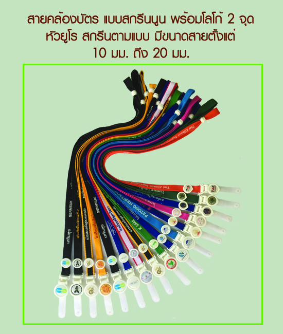 สายคล้องบัตรพิมพ์ แบบสกรีนนูน พร้อมโลโก้ 2 จุด หัวยูโล สกีนตามแบบ มีขนาด 10 มม.ถึง 20 มม.