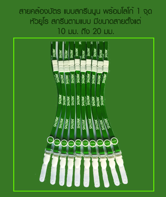 สายคล้องบัตรพิมพ์ แบบสกรีนนูน พร้อมโลโก้ 1 จุด หัวยูโล สกีนตามแบบ มีขนาด 10 มม.ถึง 20 มม.